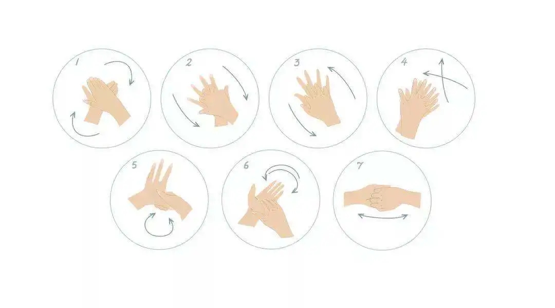 02保持手部卫生。接触公共环境或公共用品后,用肥皂或洗手液,采用七步洗手法搓洗,流水冲净。如没有洗手设施,可使用含有70%至80%的酒精搓手液(免洗洗手液)洁净双手。