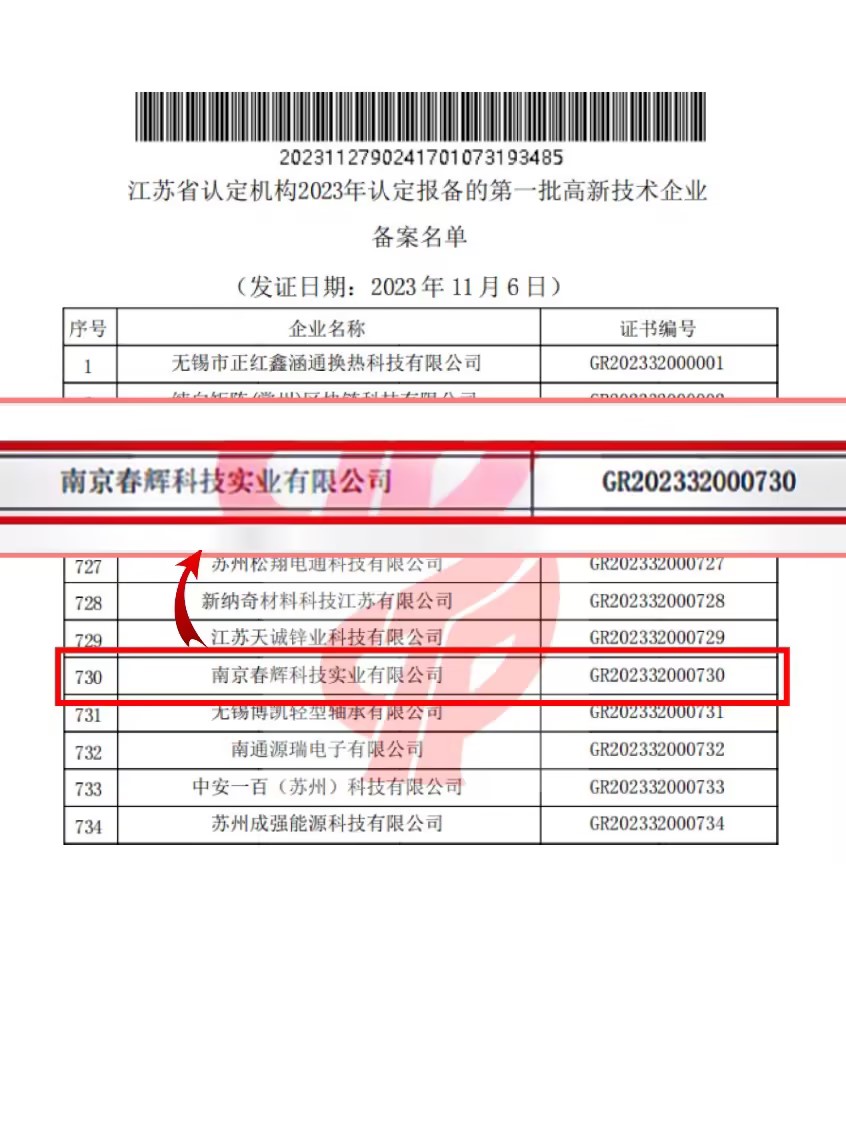 11月27日,根据《高新技术企业认定管理办法》和《高新技术企业认定管理工作指引》有关规定,全国高新技术企业认定管理工作领导小组办公室发布了江苏省认定机构2023年认定报备的第一批高新技术企业名单,春辉公司顺利通过复审认定,再次被授予国家高新技术企业称号。